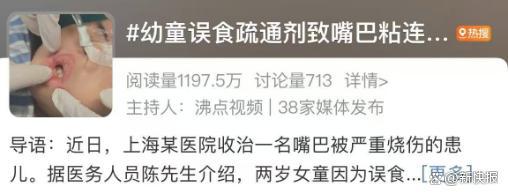 最近,话题“幼童误食疏通剂导致口腔粘连只有手指大”冲上热搜,引起关注。
