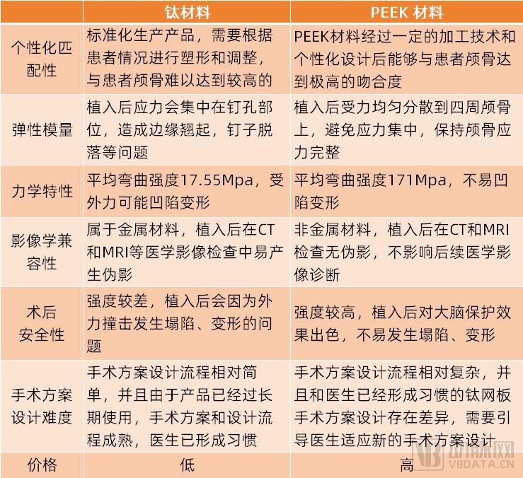 与钛材料相比,PEEK材料的颅骨修复产品平均弯曲强度更高,不易凹陷变形,对大脑的保护效果更好;经过一定的加工工艺和个性化设计,PEEK材料可以与患者的头骨达到极高的吻合度,而钛材料是标准化生产产品,需要医生根据患者情况进行塑形和优化,难以与患者的头骨达到较高的吻合度;PEEK材料导热系数低,厚度接近头骨,隔热效果接近头骨,不受冷热环境的影响。