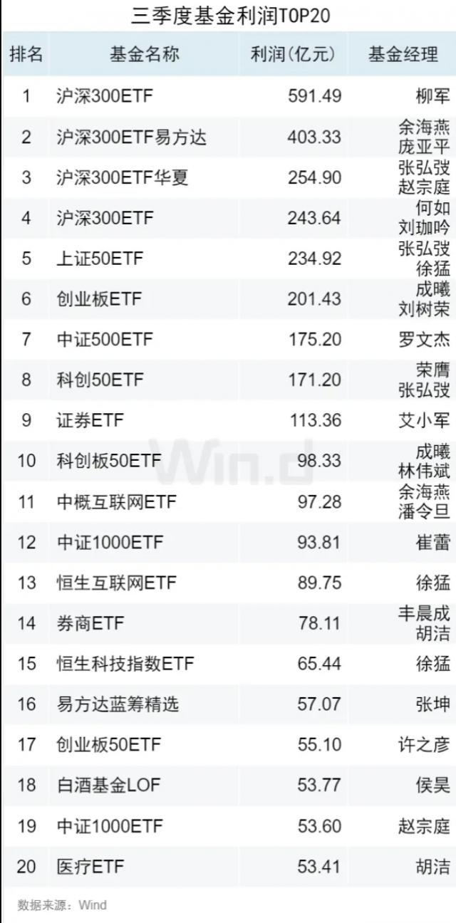 第三季度利润排名第一 10 大部分基金都是宽基金。 ETF 基金,利润一般超过百亿。