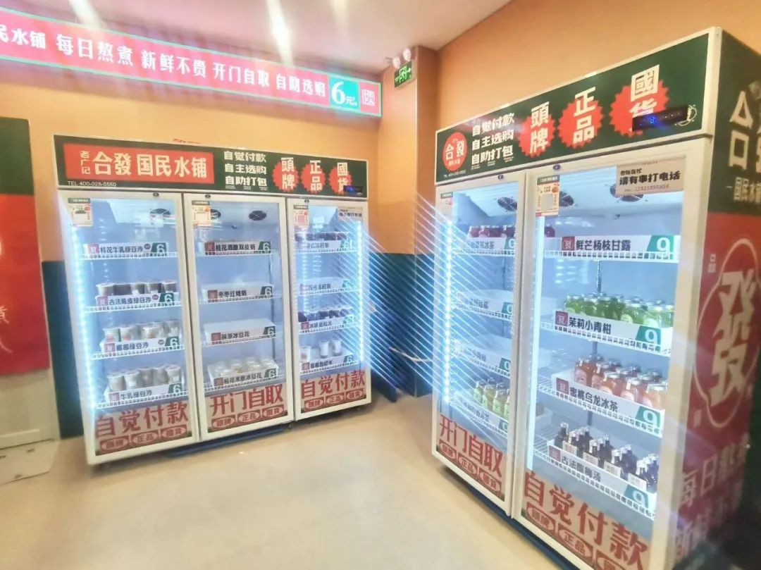 现场很多买家都被口号吸引住了。打开柜门,拿出需要购买的饮料,然后扫码支付。整个过程比自动售货机快得多。
