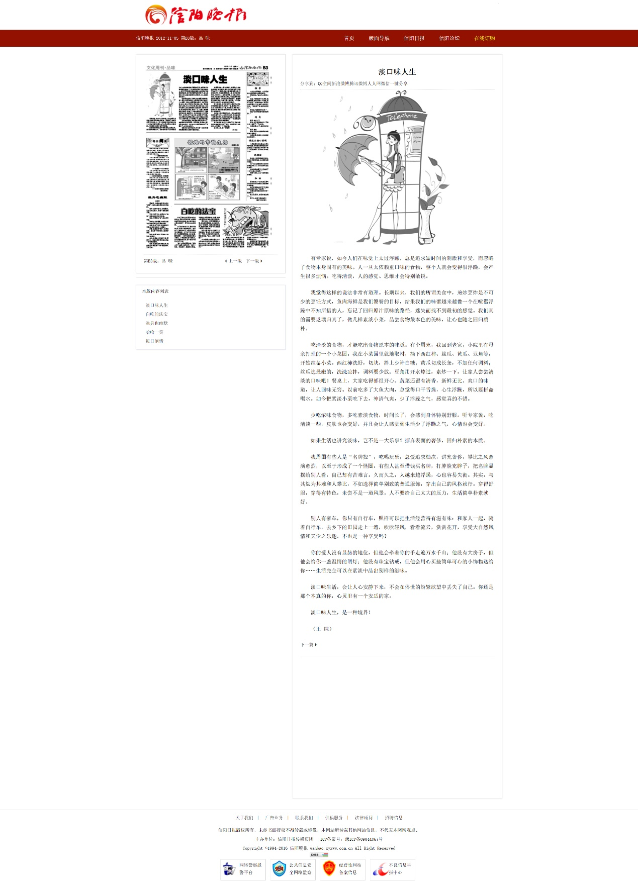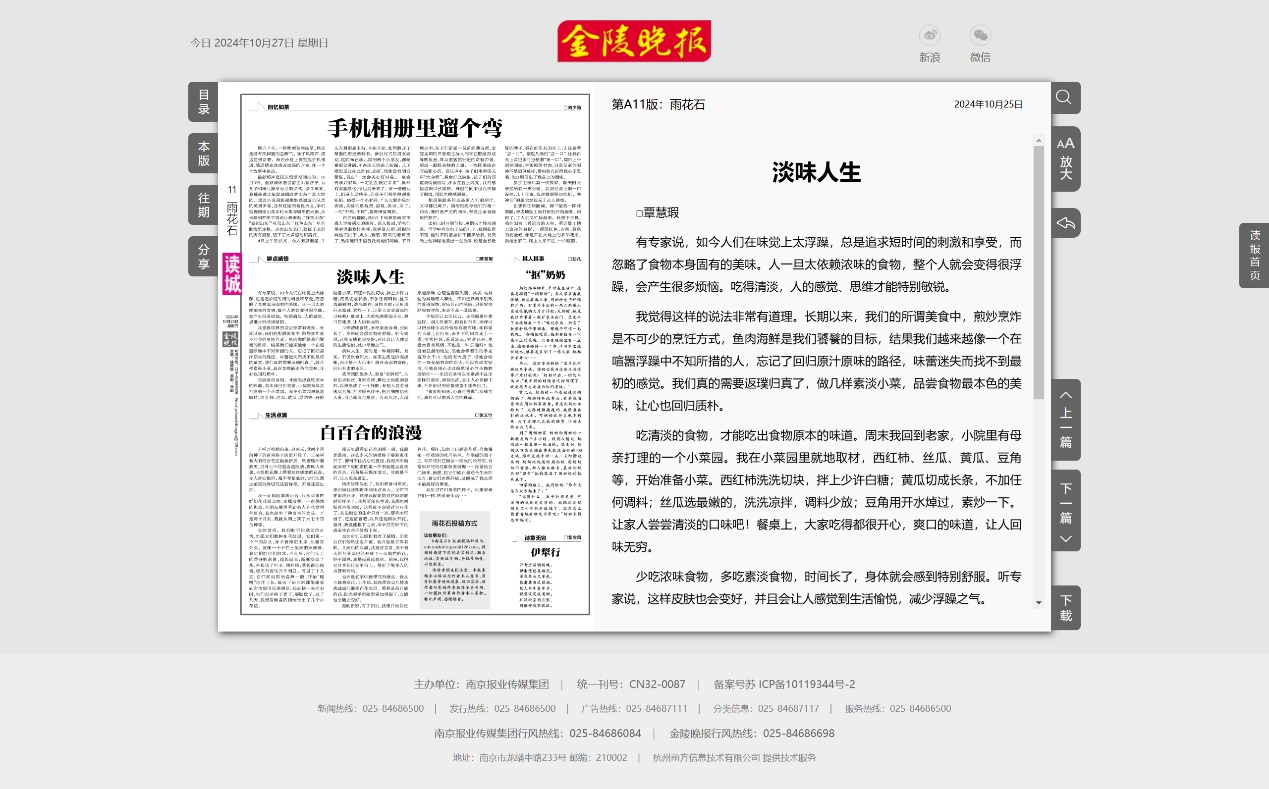 《金陵晚报》于2024年10月25日在《雨花石》副刊上发表了一篇题为《淡味人生》的文章。