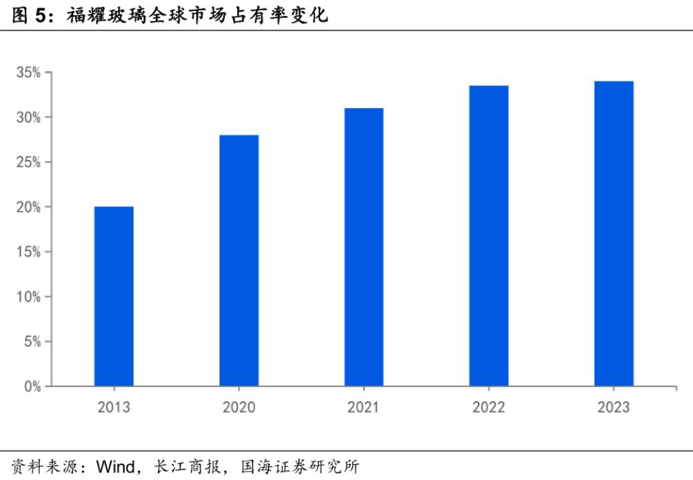 单车价值量的稳步提升让福耀玻璃在全球汽车销售量几乎保持不变的背景下实现了逆势增长,市占率也得以稳步提升。根据Marklines数据,2024年1-9月,全球汽车产量为2147万辆,同比增长1.9%u200c,福耀玻璃同期营收增幅则达到18.84%。2023年,福耀玻璃全球市占率已经达到34%,进一步拉开了对于日本旭硝子、板硝子等竞争对手的距离。