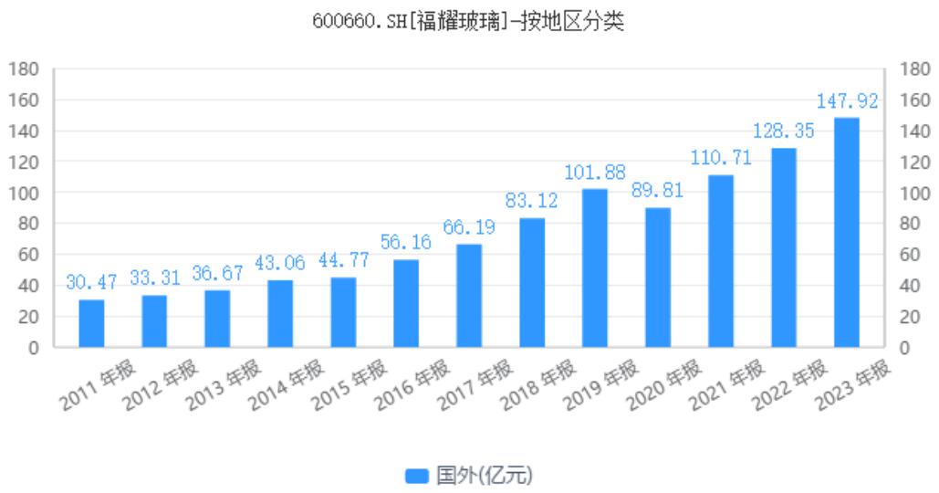 随着海外工厂的不断投产,福耀玻璃境外收入得以迅速提升。数据显示,2011年-2023年,福耀玻璃海外收入由30亿元增长至148亿元 ,海外市场占比由32%提升至44.6%。其中,福耀美国工厂营业收入从2016年刚投产的7.21亿元增长到2023年的55.7亿元,总营收占比接近17%。