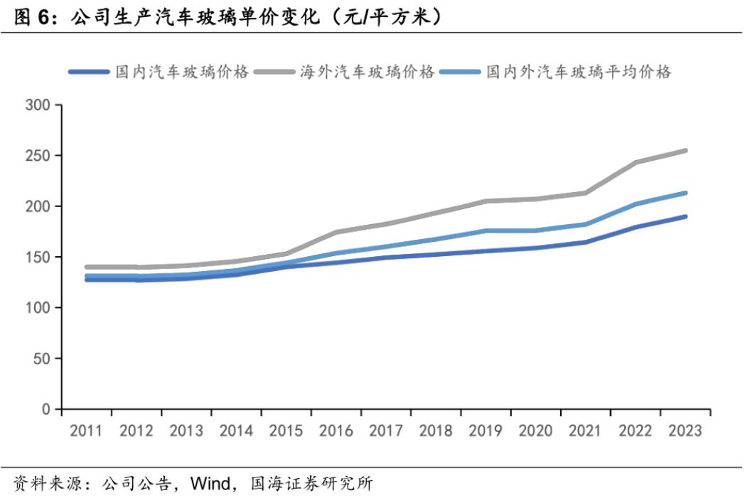2023年全年,福耀玻璃智能全景天幕玻璃、可调光玻璃、抬头显示玻璃等高附加值产品占比较上年同期上升9.54个百分点。随着高附加值产品占比的不断提升,2023年福耀玻璃汽车玻璃价格已提升至213.2元每平方米,同比增长5.94个百分点。