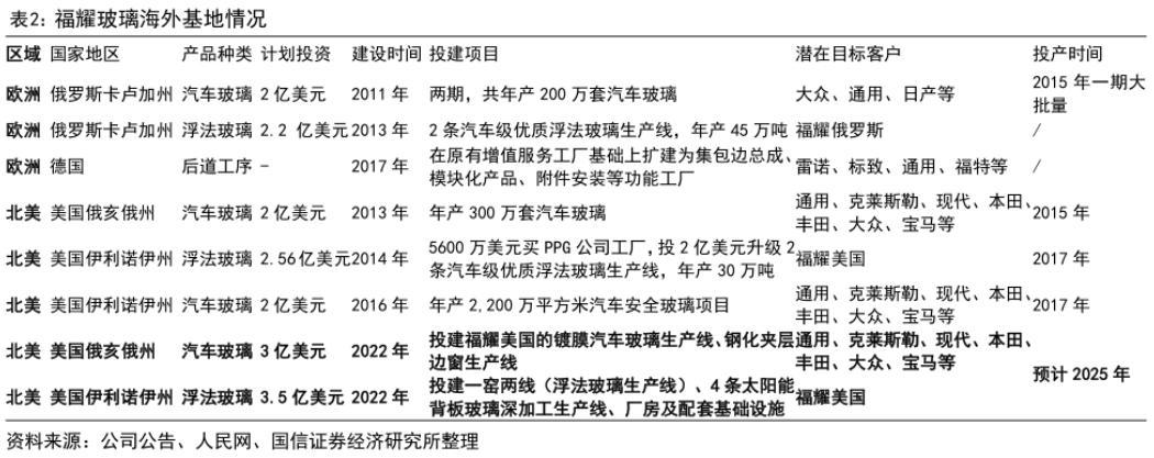 2013年,福耀玻璃在美国俄亥俄州独资设立子公司投资2亿美元建设汽车安全玻璃项目。截止2017年末,福耀玻璃在北美已建成550万套汽玻产能,累计投资金额6亿美元。2022年,福耀玻璃分别在美国俄亥俄州、伊利诺伊州加码产能,投资金额分别为3亿美元、3.5亿美元。