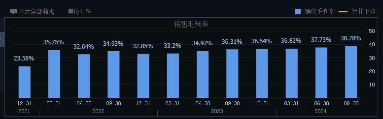 不难看出,福耀玻璃前三季度尤其是第三季度净利润增速要远高于公司营收端增速,这主要源于公司毛利率的提升。2024年Q1-Q3,福耀玻璃毛利率分别为36.82%、37.73%和38.78%,前三季度综合毛利率达到37.82%,较去年同期(34.94%)提升近三个百分点,同时也创下自2021年以来新高。