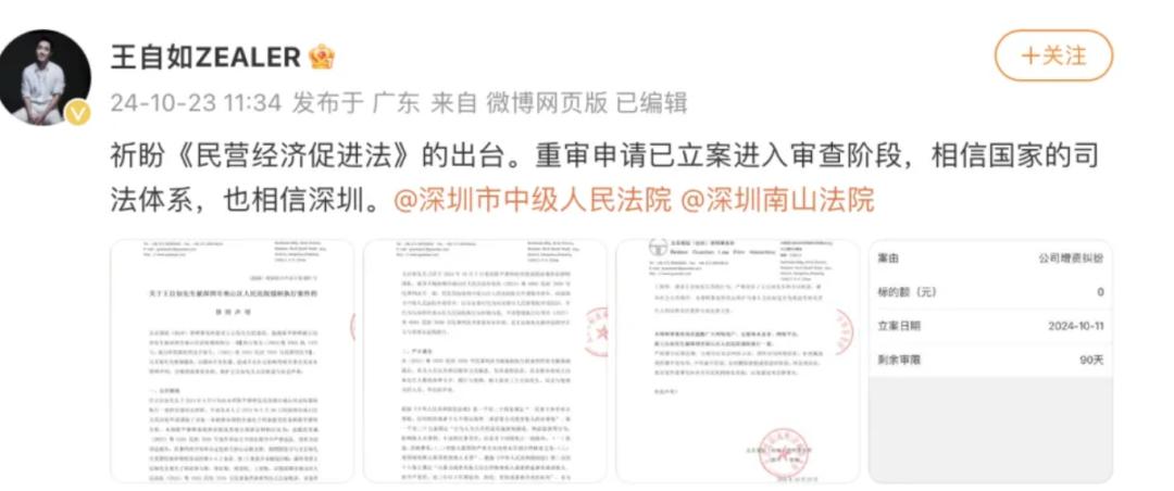 最近在微博上,前段时间上热搜的王自如公开了一个信息:“重审申请已立案进入审查阶段,相信国家的司法体系,也相信深圳。”