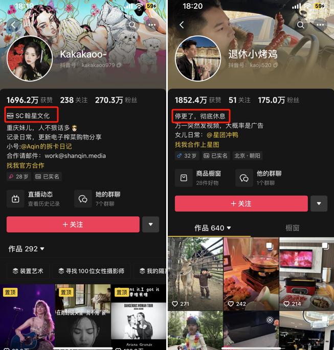 新播场发现,此前微念旗下的头部达人@kakakaoo-的抖音主页显示MCN机构为“SC翰星文化”,微博主页虽然没有显示,但其商务联系方式与抖音一致;其他头部达人如@香喷喷的小烤鸡 已选择停更。