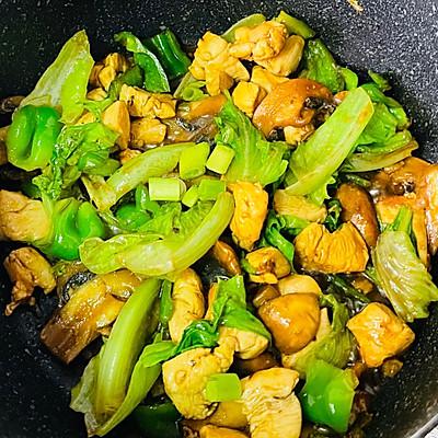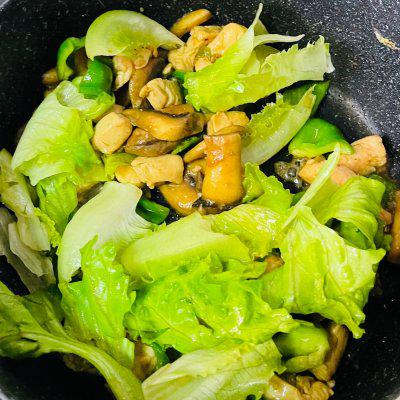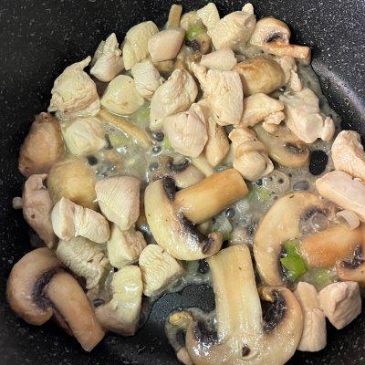 6、将蘑菇炒成水分,加入鸡胸肉丁翻炒。