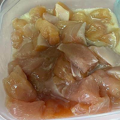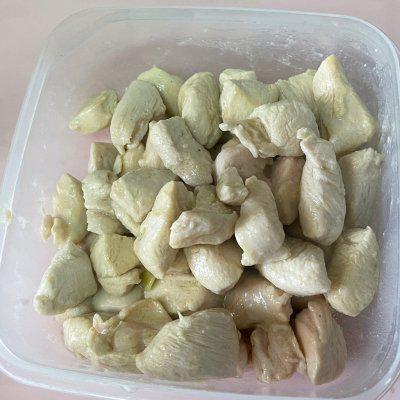 3、用盐、淀粉、米酒、白胡椒粉腌制鸡胸肉切丁。 15 分钟
