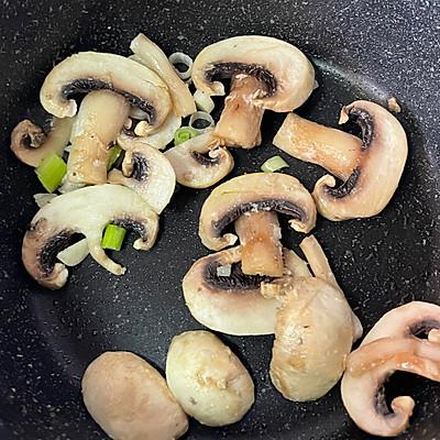 5、将适当的藤椒油倒入热锅中,加入葱蒜爆香,放入进口蘑菇片炒一炒。