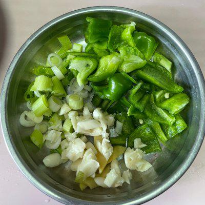 8、加入青椒块翻炒断生后,倒入两勺薄盐生抽,大火炒匀即可。