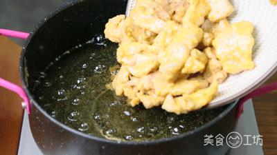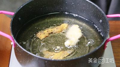 5. 油温高达80%的热量,加入小酥肉再炸至表面金黄。
