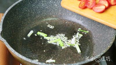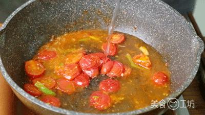 6. 另外一锅,加入葱段和姜末爆香,倒入圣女果炒汁(可以用勺子轻轻按压或加入番茄酱)。