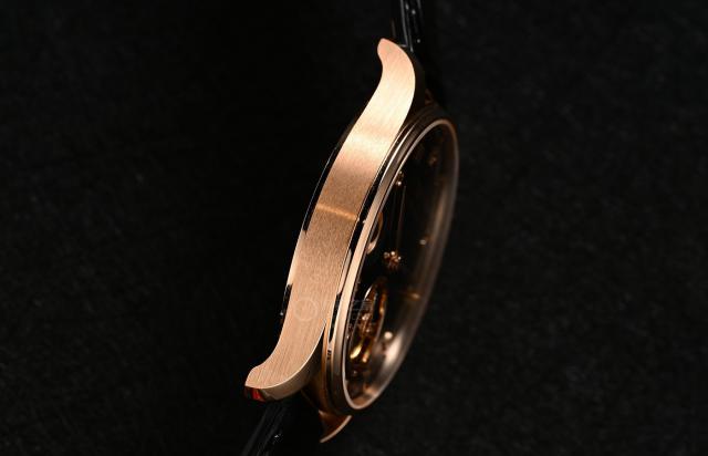 同时,从物理运行效果来看,我认为夜晚有一个黑色的球,随着日出时间慢慢运行到代表白天的金色,这种金色真的打亮了高度抛光的黑曜石表盘、金色飞行陀飞轮笼架、 42.4 mm 18K Armor Gold ® 硬金表壳相互呼应,在功能和设计美学上达到完美的平衡。