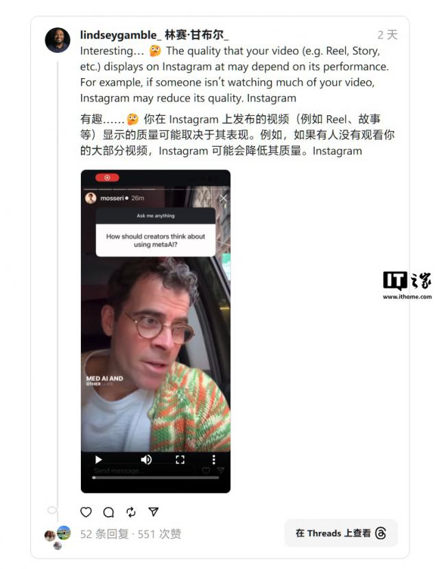 IT 世家 10 月 28 北京时间今天早上,据日消息, The Verge 报道,Meta 高管、 Instagram 和 Threads 负责人 Adam Mosseri 表示,流行的视频会以更高的水平呈现,而关注较少的视频会降低清晰度。