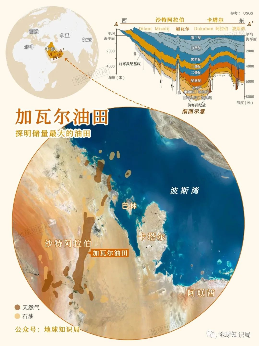 沙特阿拉伯国家命脉“加瓦尔油田”,产层深度2200米,探明储量高达107.4亿吨,是我国近三倍,成本低至不到10美元,打败了世界。