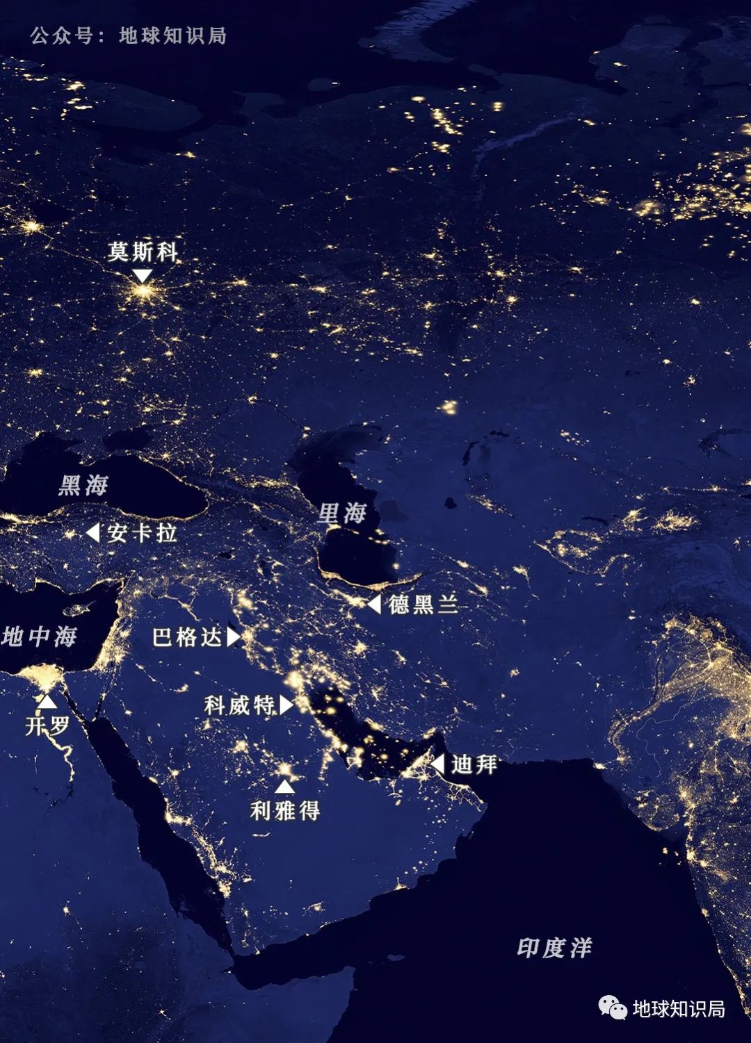 这种合作关系在地球夜晚的灯光中一目了然。从东亚到东南亚和南亚,这些季风地区的灯光基本来自人口、城市和工业的巨大数量,而“亚洲西部地区”中东、中亚和西伯利亚的许多灯光来自油田和气田。通过油轮和管道,亚洲物品两大经济体系实现了大洲级的互利合作。