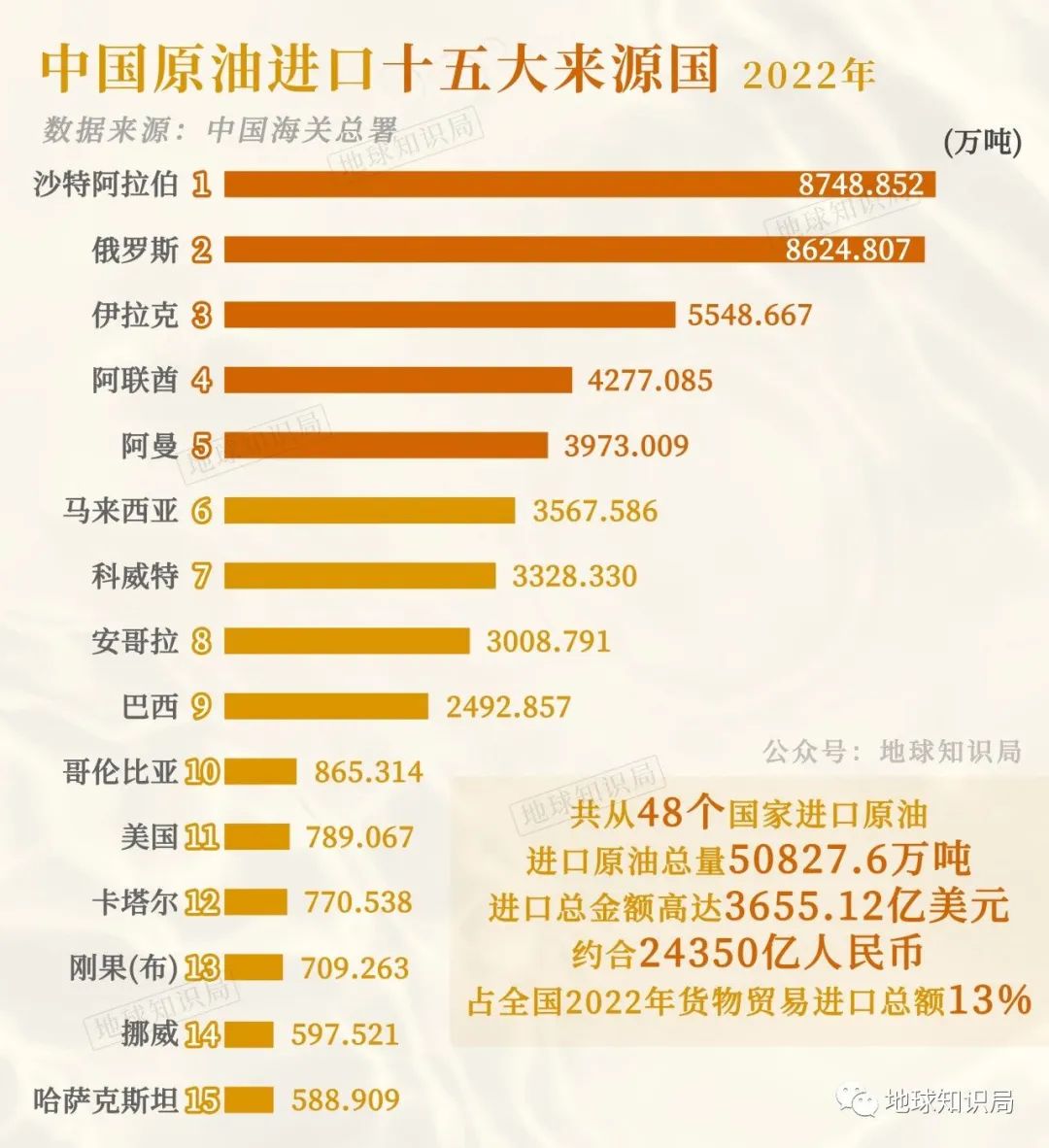 2022年,中国进口原油的资金转换为2.43万亿元,沙特阿拉伯排名第一,俄罗斯排名第二,全部销售超过8000万吨。其次是伊拉克、阿联酋、阿曼、马来西亚、科威特和安哥拉。