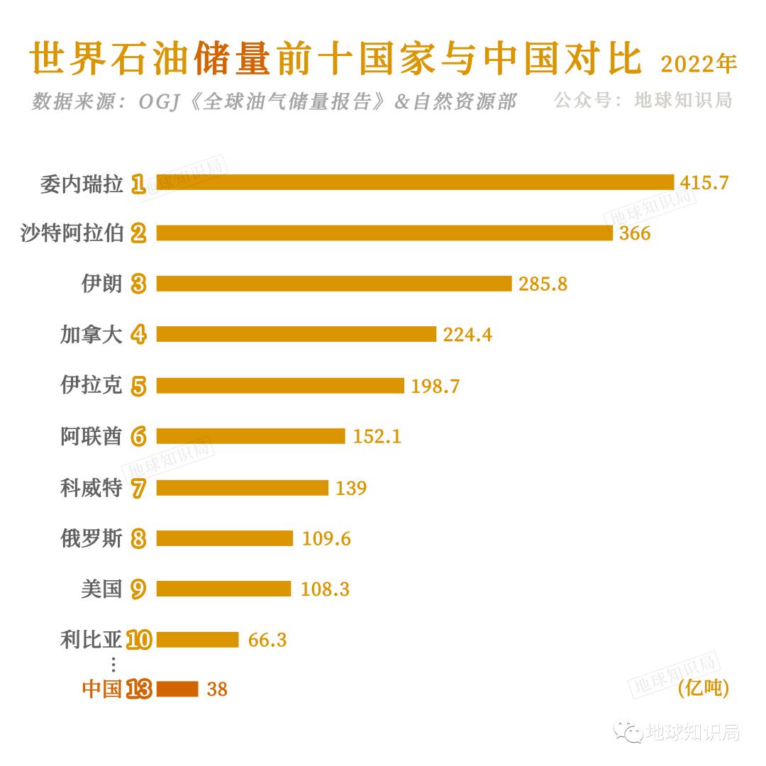 据自然资源部(2022年全国矿产资源储量统计表)统计,2022年,中国石油储量约为38亿吨,仅占全球储量的1.58%,位居世界第13位。