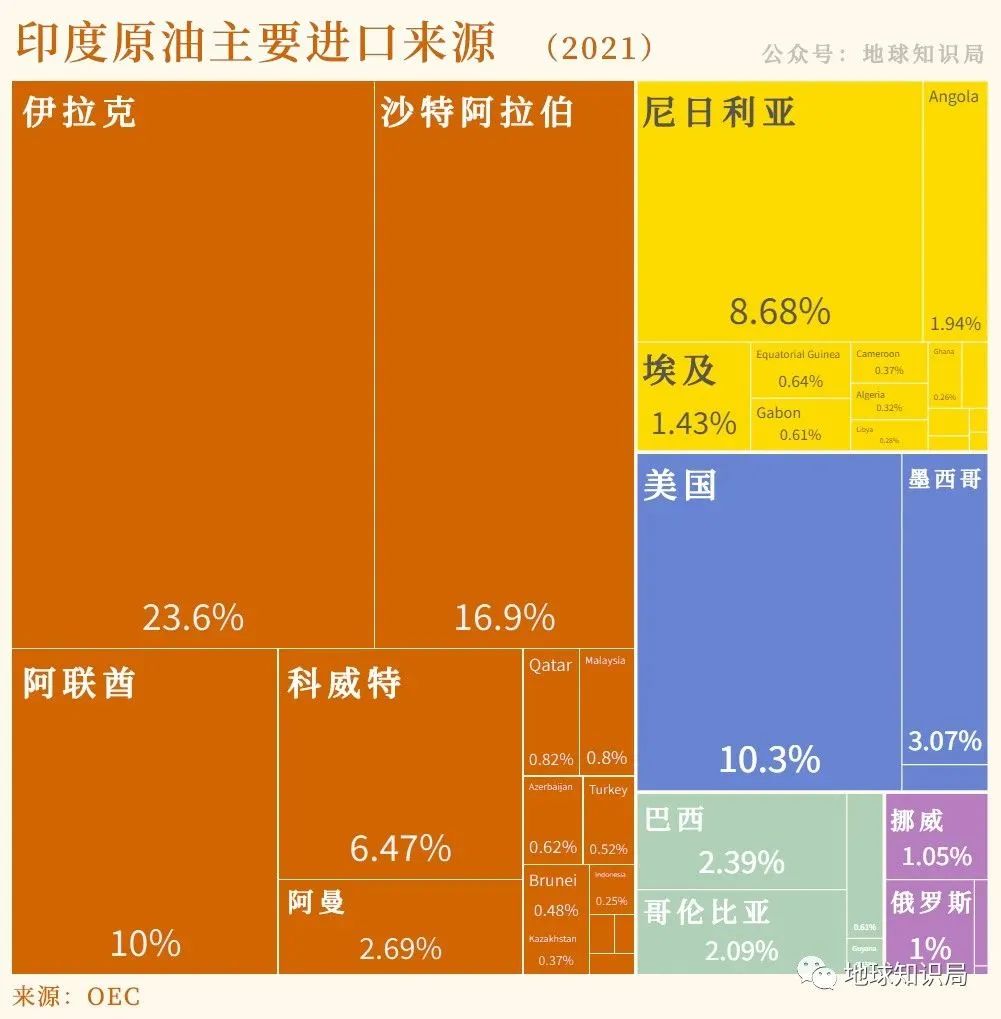 在客户阵营中,中国是关键部分,但并非全部,同样是季风区的印度,石油对外依赖程度高达85%,所以非常重视与海湾国家的关系,去年更是疯狂地购买低价俄罗斯石油,其进口成分与中国也颇为相似。