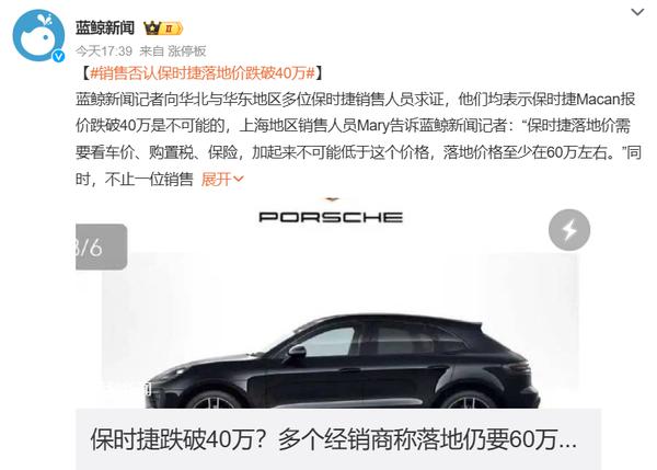 销售否定保时捷地价跌破地价 40 万:至少要 60 万左右