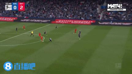 第 39 分钟,穆西亚拉大禁区线得球后,调整起脚兜射,足球高于横梁!↓