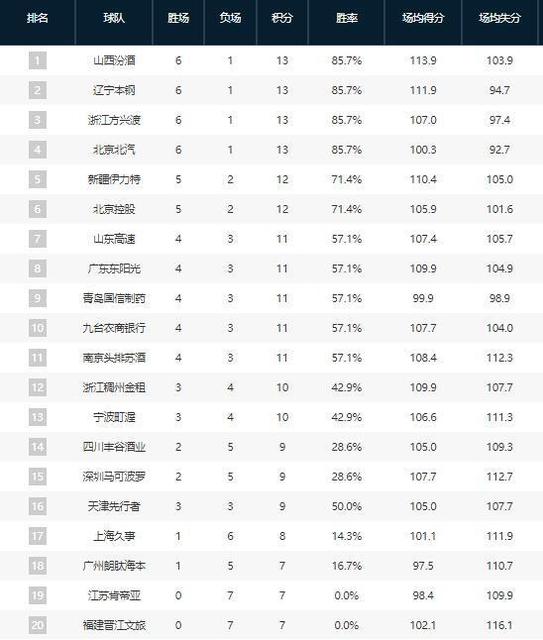 第七轮比赛结束后,CBA 排名也发生了很大的变化。首先是因为北京男篮在这轮比赛中输了,战绩和山西男篮、辽宁男篮、广厦男篮一样,都是6胜1负。由于相互的输赢战绩和净胜分的影响,山西男篮目前排名第一,辽宁男篮、广厦男篮、北京男篮分别排名第二和第四。