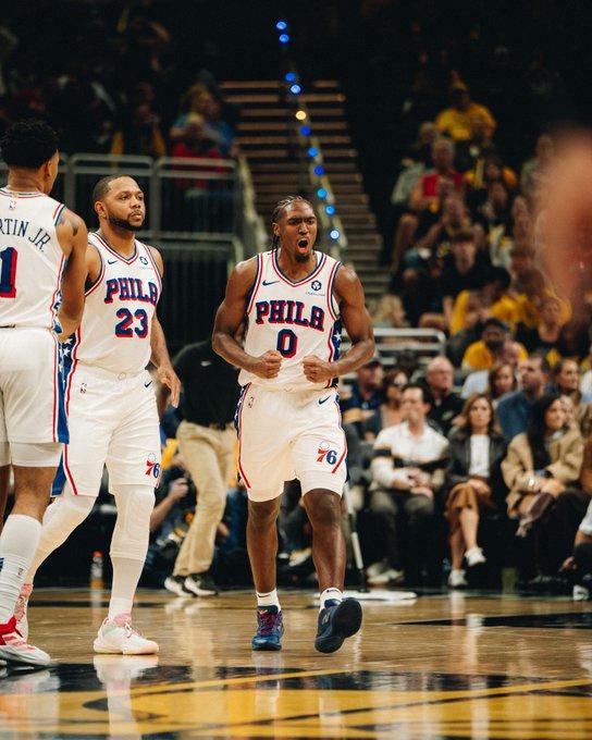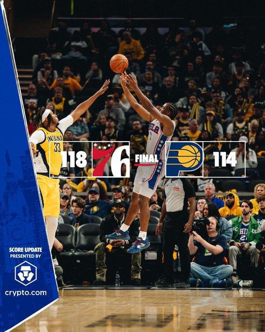 76人加时赛险胜步行者获得首胜。 哈利伯顿,马克西45分,丢平两罚。