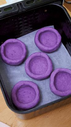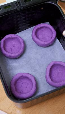 5、此时再将搅拌好的挞液淋入紫薯芋泥小碗中,淋入紫薯芋泥 8 只需满分即可,空气炸锅 170 度烤 18 分钟。但我也想说,因为每个烤箱的情况都不一样。假如感觉表面着色都很差,那就再烤一会儿。