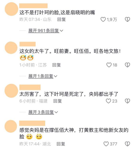 打开评论区,就是网友的辛辣内涵“这不是打叶珂的脸,这是扇小明的嘴”、"感觉央妈是在撑伍佰大神,打黄教主和叶珂的脸"。