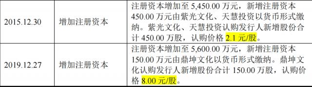 值得注意的是,天慧投资的股票价格是 2.1 元 / 股票,与紫光文化一致,低于 4 年后鼎坤文化增资时, 8 元 / 股票。外部员工和员工的股票价格是一致的,中超股权曾被要求解释天慧投资低价股票的原因和合理性。