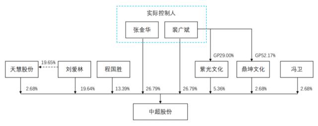 当前,中超股权由裴广斌、张金华共同控制,两人的直接持仓均为 裴广斌通过员工持股平台间接控制紫光文化和鼎坤文化,26.79% 8.04% 股权,两人通过一致行动人协议,合计控制 61.61% 的股权。