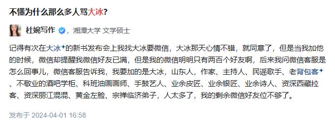 “ 有一次在大冰新书发布会上来到微信,但是加的时候显示我的微信朋友已经满了。 ”。