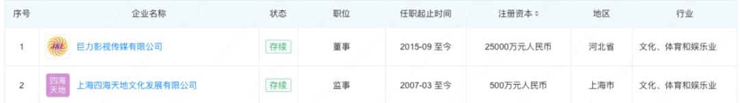 天空调查显示,杨子和黄圣依共有两家公司,分别是巨力影视有限公司和上海世界天地文化发展有限公司。其中杨子担任巨力影视总裁,黄圣依担任执行总裁,两人分别持有30%的头寸。、10%。