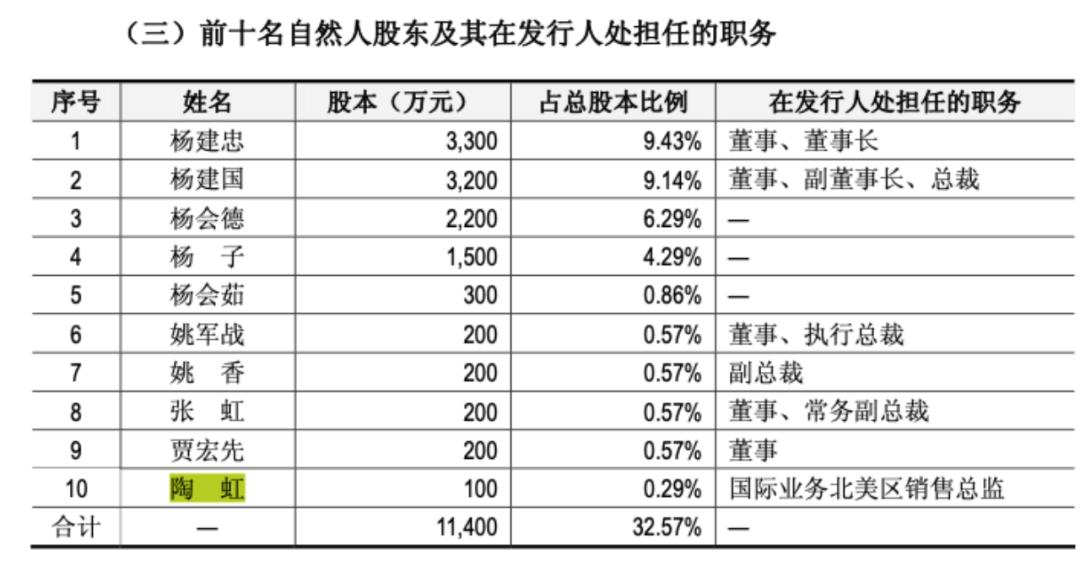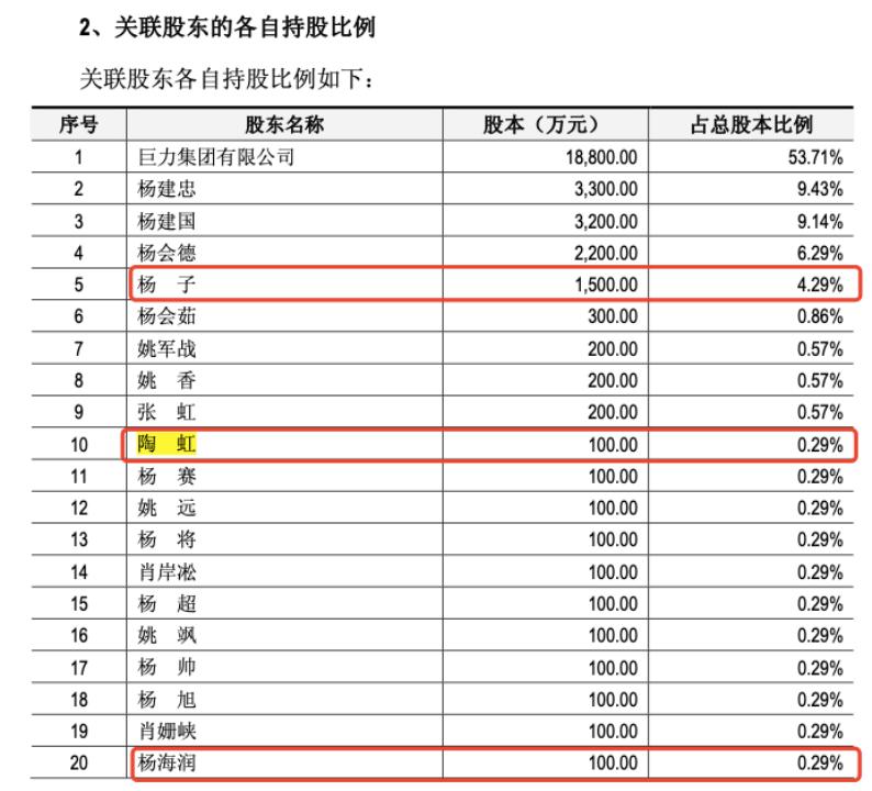 但是在巨力索具中在2009年的《招股书》中,杨子的配偶是陶虹,两人还有一位名叫杨海润的女儿,陶虹、杨海润均在巨力索具中持有0.29%的位置。