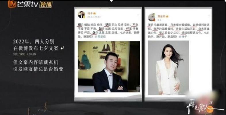 在节目中,他们还透露,他们在2022年七夕完全分开了。黄圣依和杨子以藏头文字的形式发布微博。黄圣依的言论是:岁月如歌,各自珍惜,而杨子的言论是:与其想念对方,不如想念对方。