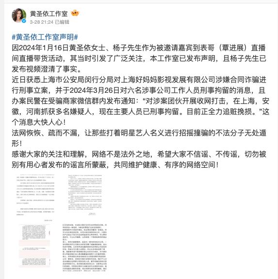 黄圣依工作室回应说,黄圣依和杨子是应抖影文化的邀请,作为嘉宾到@表哥的直播间帮忙推荐带货。二人未作出任何招商等授权手段,以及任何保量等承诺。,而且两人全面履行了合同内容,包括约定的直播时间,需要作为嘉宾推荐30款指定产品。尽快督促抖影媒体严格履行各商家和品牌所有者的合同,及时妥善处理善后事宜。