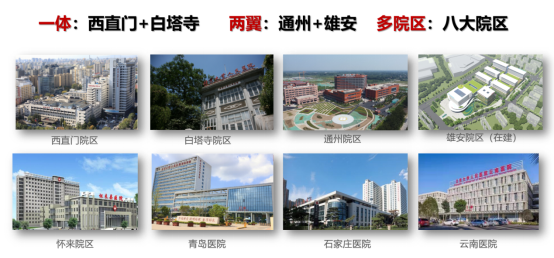 目前,医院正在运营西直门院区、白塔寺院区、通州院区三个院区,积极推进雄安院区建设;与山东省青岛市、河北省石家庄市、云南省昆明市合作建设国家区域医疗中心,代管怀来院区,与唐山市工人医院、信阳市中心医院合作建设学科区域合作中心,充分发挥优势学科和优质医疗资源的辐射带动作用,不断提高人们的健康获得感。