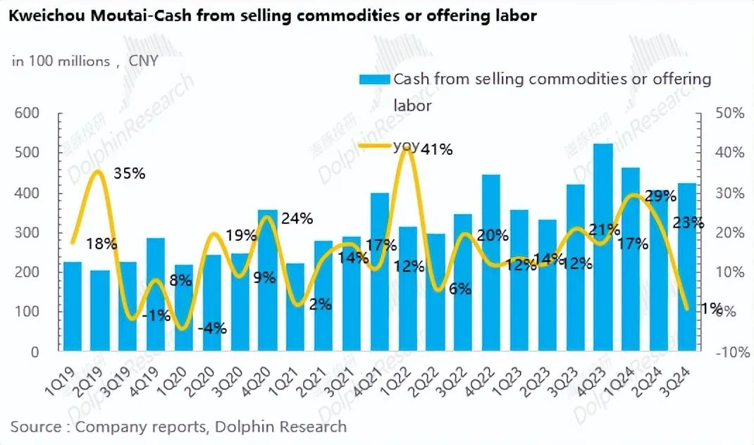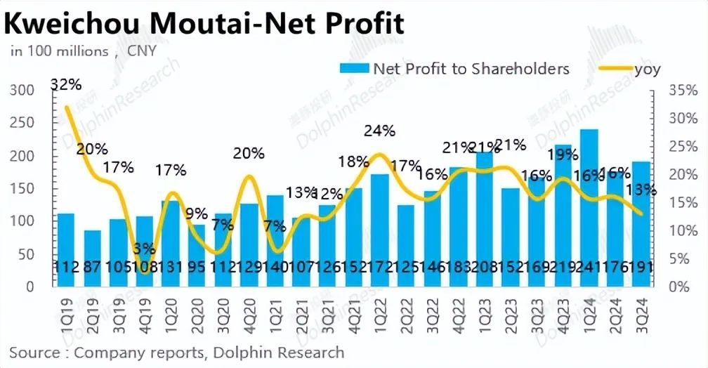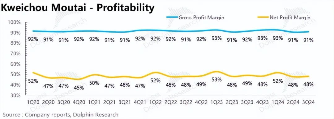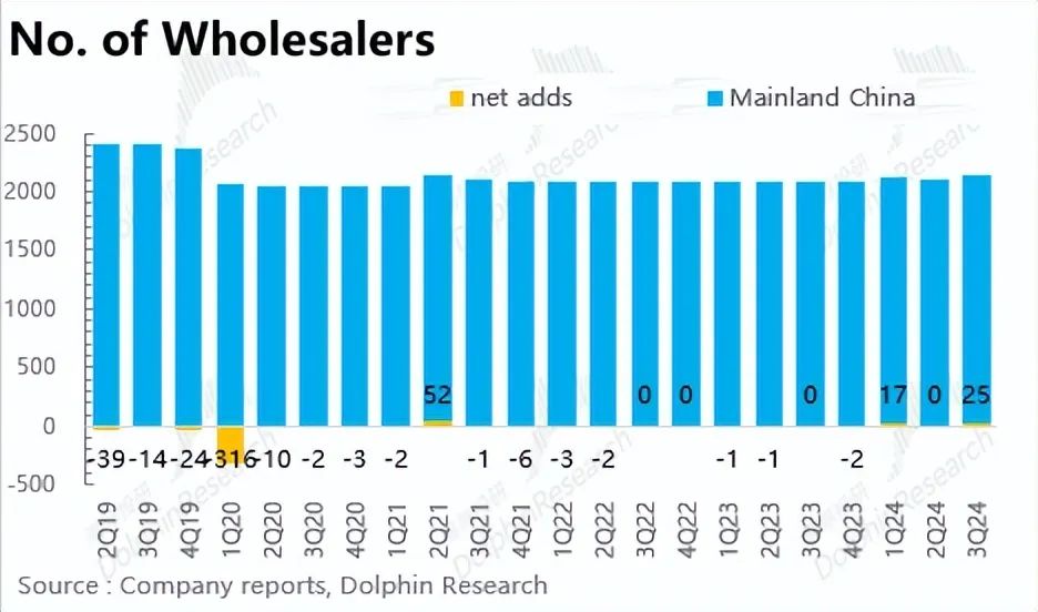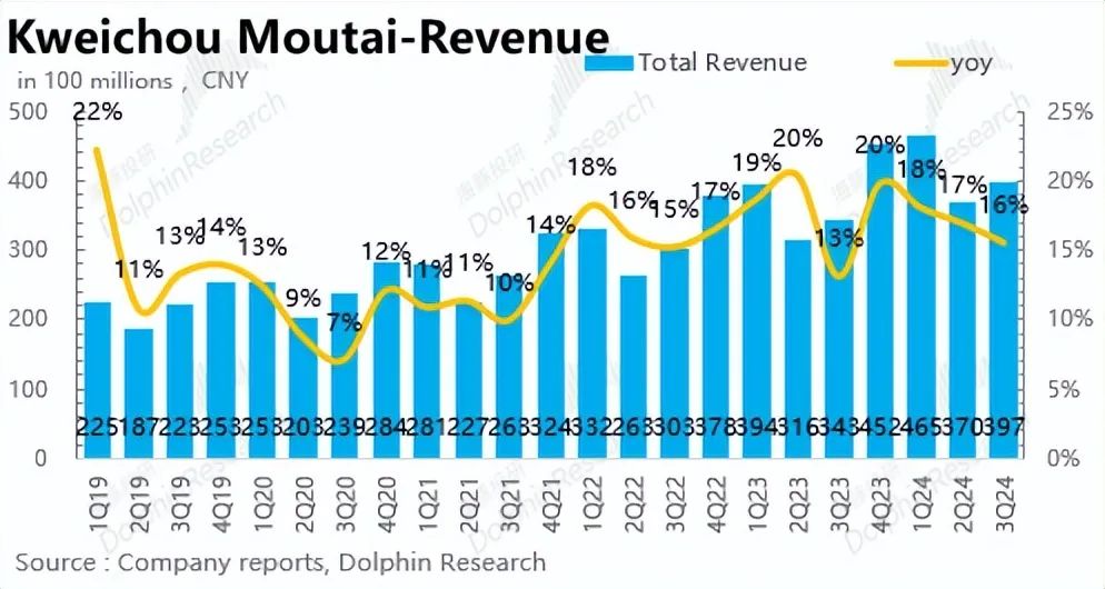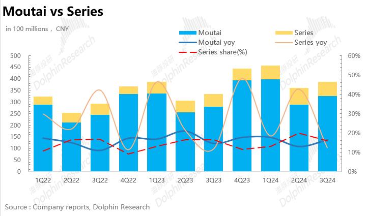 3)此外,从经销商数量来看,截至第三季度,茅台在2024年增加了42家经销商,都是系列酒经销商,其中第三季度增加了25家。不难发现,茅台还是很重视系列酒的。虽然第三季度系列酒的增速有所放缓,但海豚君认为系列酒在消化库存后,仍然是茅台未来业绩增长的关键环节。