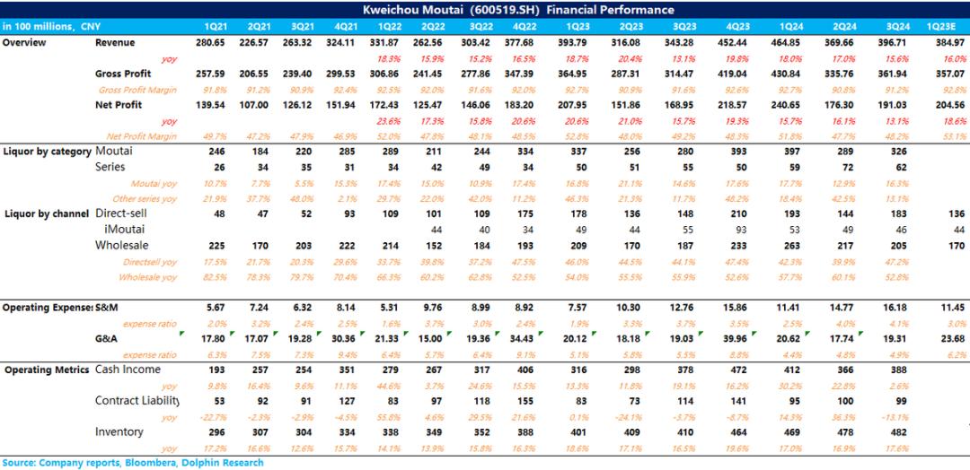 第一季度,茅台总收入和净利润分别达到397亿元和191亿元,同比增长16%。、与第二季度相比,13%都放缓了。具体来说,茅台的增长率还是比较稳定的,但是系列酒的增长率从上个季度的43%放缓到了13%。海豚君了解到,主要是因为茅台1935年第三季度停止发货,升级酒体,重新选择经销商,影响了出货量。