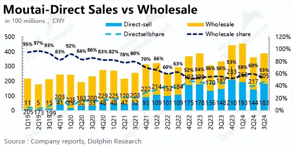 从渠道来看,第三季度,茅台直接供应比例改变了上半年的下降趋势,再次大幅回升,收入占比达到47%,接近历史最高水平。这也证明,在批准价格持续下降的情况下,第三季度经销商可能仍在观望,因此茅台仍需阶段性增加直接供应比例,以实现业绩的稳定增长。