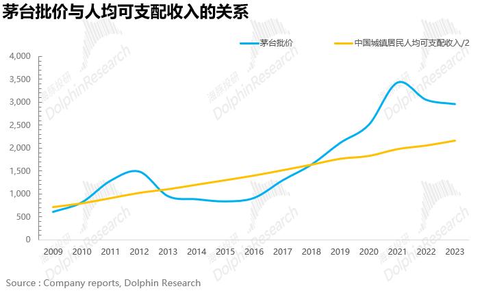 b)从人均可支配收入的角度来看,通过重新审视茅台过去的批价变化,可以清楚地发现,茅台的批价在中国城市居民可支配收入的一半左右波动。正如张德芹董事长在股东大会上所说,茅台的品牌价格必须与目标消费群体相匹配,价格将随着经济和社会形势的变化而调整。因此,进一步分析可以发现,当茅台的批价大大偏移了人均可支配收入的一半时,茅台通常会干涉,促使批价回归理性,而目前人均可支配收入的一半在2200元左右。所以海豚君认为2200元是茅台批价的合理水平。