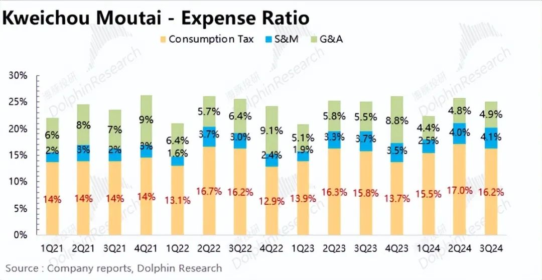 从盈利能力来看,第三季度企业毛利率为91%,仍保持超高水平,一直稳定。净利率为48%,较去年同期下降1%。经海豚君分析,问题在于销售费率和消费税率。