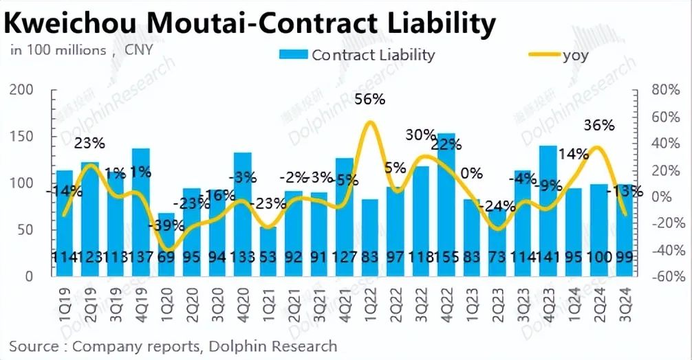 4)从现金流来看,茅台第三季度实现了426亿元的回报,同比只增长了1%。与前两季度相比,明显放缓。海豚君认为主要部门是企业主动控制商品,提高价格。从“储水池”合同负债来看,到第三季度,茅台合同负债达到99亿元,与第二季度末基本一致,说明渠道信心相对稳定。