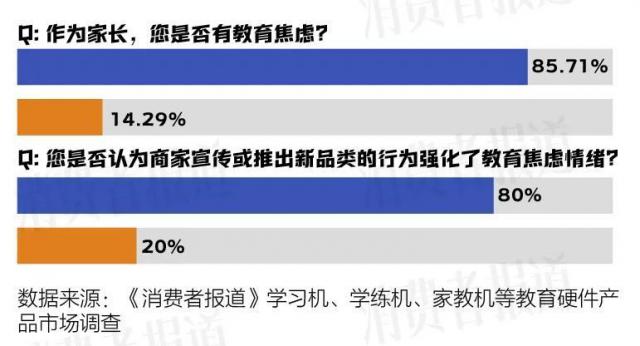 2024年,为调查教育硬件产品的市场状况和行业信息, 年 10 月份,《消费者报告》对问卷进行了调查,最终收回 882 一份有效的问卷。问卷调查数据显示, 86% 父母表示有教育焦虑,80% 受访者认为,商家宣传或推出新品类的行为加强了教育焦虑。