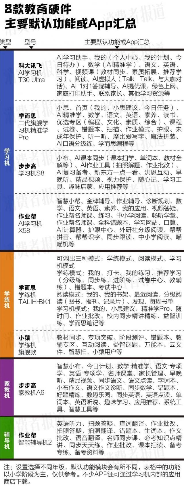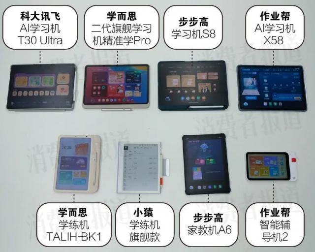 我们购买了市场上销售额较高的产品。 4 款学习机、2 款学练机、1 款家教机、1 与学习与思考、科大讯飞、小猿、作业帮、步步高等品牌进行比较。数据显示,学习机的内容比较齐全,默认功能比同类产品更全面,而学习机、家教机、指导机的很多内容都与学习机重叠。