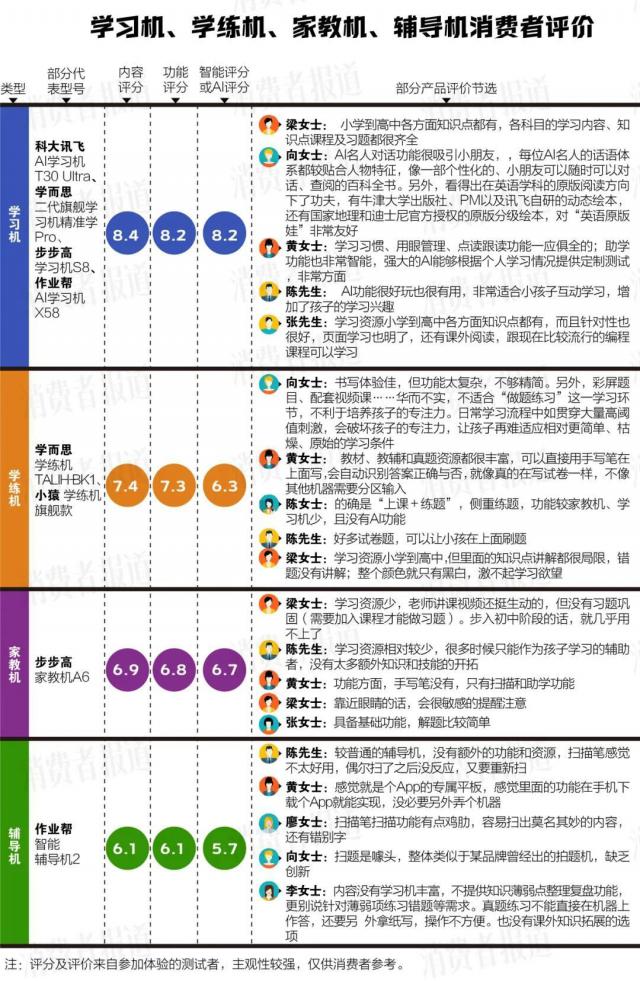 2024 年 10 月份,《消费者报道》对教育硬件市场进行了问卷调查,并对市场上销量较好的市场进行了调查。 8 一种教育硬件进行了感觉测试,包括 4 款学习机、2 款学练机、1 款家教机和 1 该指导机涉及学习与思考、科大讯飞、小猿、作业帮、步步高等品牌。