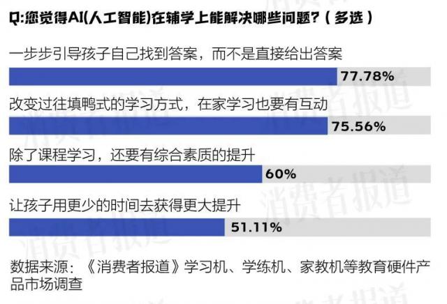 根据《消费者报告》问卷调查数据,“你期待” AI ( 人工智能 ) 关于辅助学习可以解决哪些问题,受访者希望:AI 应根据学生的学习习惯、能力和进步,因人施教,提供个性化的学习方案;同时也能有趣有用地充分激发学生的逻辑能力、创新能力等;能够与学生进行智能互动;提高学生的综合素质;充足的智力,可以在一定程度上代替家长或教师辅导学业,自学,不断发展。