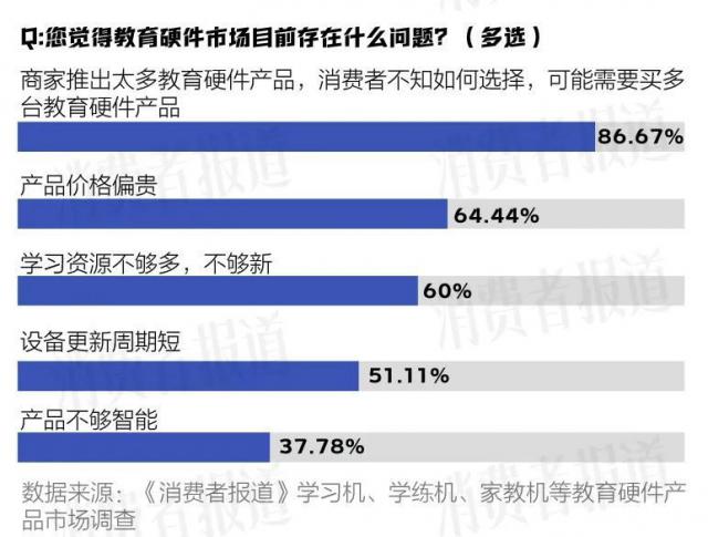 但是快速增长也带来了许多混乱。根据《消费者报告》问卷调查数据, 86% 受访者表示:“商家推出了太多的教育硬件产品,客户不知道如何选择,可能需要购买多种教育硬件产品”。